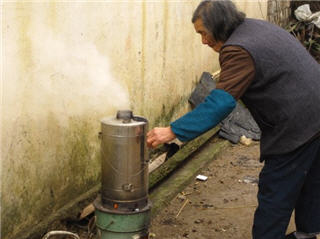 Old Chinese Lady using the Pasteurizer / Boiler for making hot