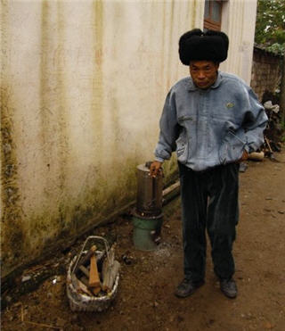 Old Chinese Man with his Stove, Water Heater and his Firewood.